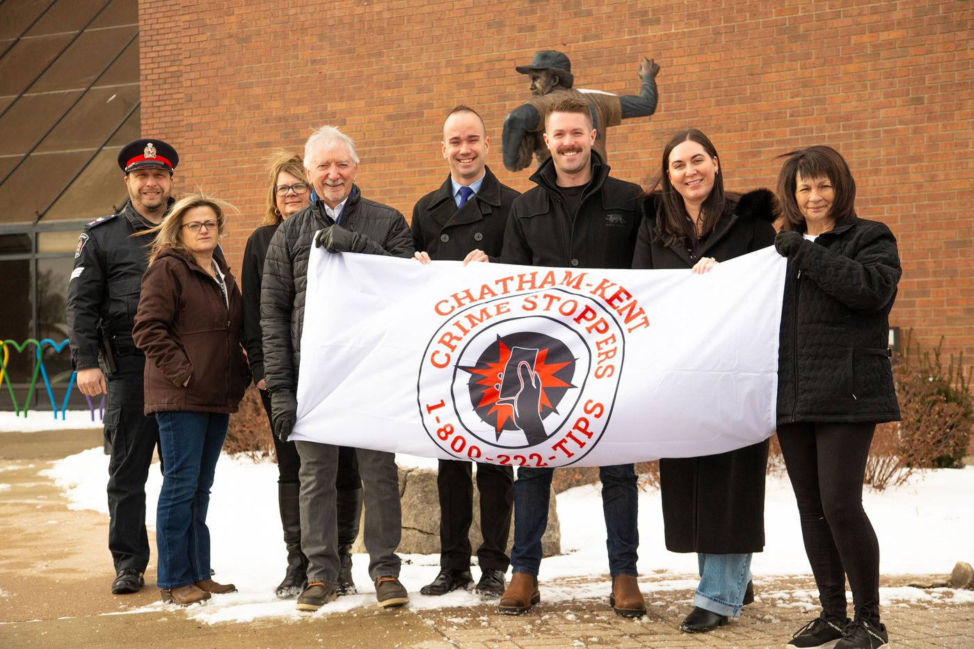 Chatham-Kent Crime Stoppers Awareness Month kicked off with a flag-raising ceremony at the Civic Centre on Jan. 2, with ‘Safe Streets, Strong Communities – Together We Can Stop Crime’ this year’s national theme. Pictured, from left: CKPS Sgt. Joshua Flikwert, President; Sarah VandenBrand, Board member; Nancy Havens, Vice President; Bill Isaacs, Board member; Aaron Hurst, Board member; Nate Young, Coordinator; Erica McIntosh, and Board member Angie Shreve.