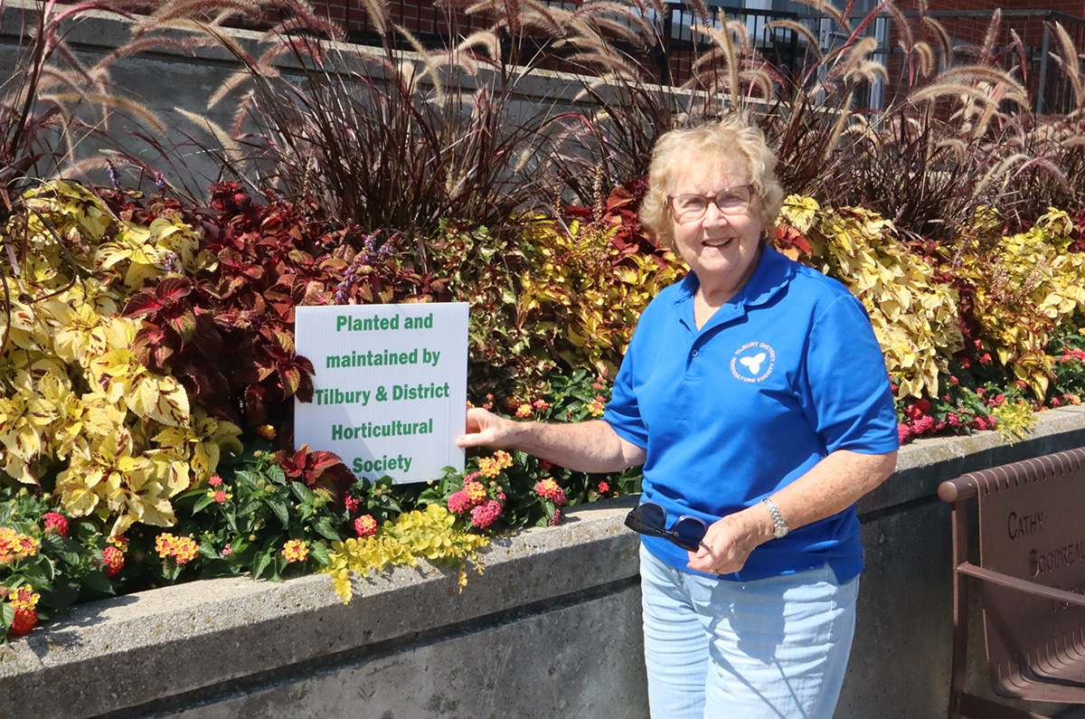 Linda Linda Henderson keenly standing by a large greenery display at the Tilbury Post Office. Photo by Georgia LeBlanc