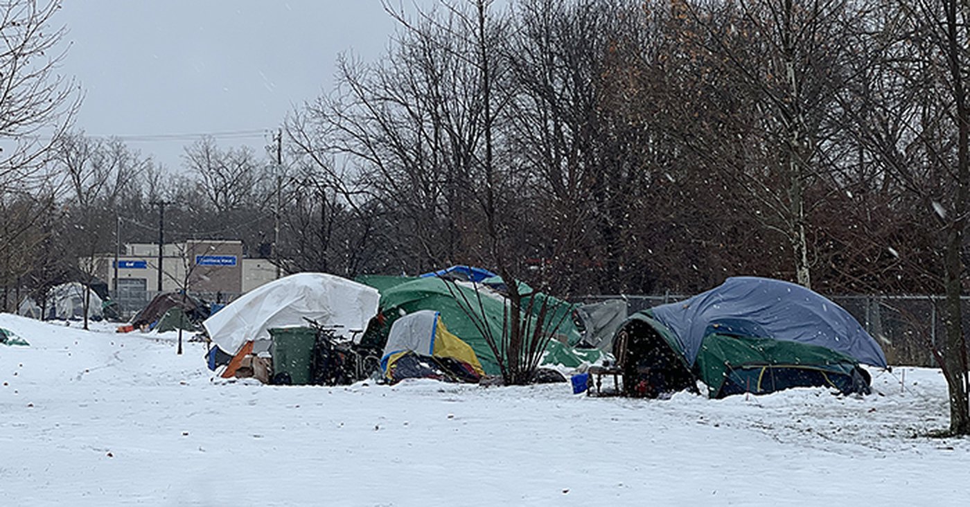 Snow falls on tents at the homeless encampment on Grand Avenue East in Chatham. Ontario’s Big City Mayors group, including Chatham-Kent Mayor Darrin Canniff, are calling on the province to declare homelessness a state of emergency.