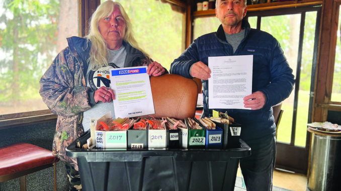 Mitchell's Bay area resident Christine Burke and local geologist Keith Benn display some of the paperwork that's part of the ongoing fight to get the Ontario government to test for heavy metals in black well water. Burke's well has been spewing dirty water for more than a decade. She recently received a letter from Ontario Ombudsman Tom Baker stating the Ministry of Health is finished with the matter, and that's not sitting well with worried residents. Pam Wright, Local Journalism Initiative Reporter