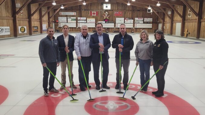 The Ontario Federation of School Athletic Associations curling championships will be held in Chatham-Kent next spring. The four-day event will be held at the Ridgetown Curling Club, the Golden Acres Curling Club in Blenheim, and the Chatham Granite Club. On hand for the announcement were, from left, Darcy Kalp and Steve Whyte of host Ursuline College, event co-chair Matt McKay, Mayor Darrin Canniff, Don Taylor of the Chatham club, Martha Wickwire of the Ridgetown Curling Club and Debbie Sanders of the Golden Acres Club. Photo submitted to The Ridgetown Independent News